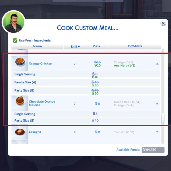 —Optional Ingredient: 1 Orange + 1 Cocoa + 2 simoleon flat fee for Single Dish ( No Custom version – harvestable Orange and cocoa bean not required)
