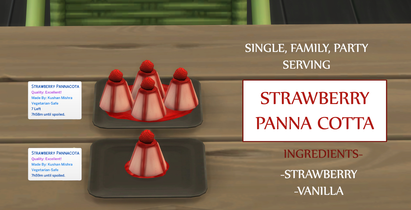 —Optional Ingredient : 1 Strawberry + 1 Vanilla + 20 simoleon flat fee for Single Dish (No custom version requires only Strawberry)