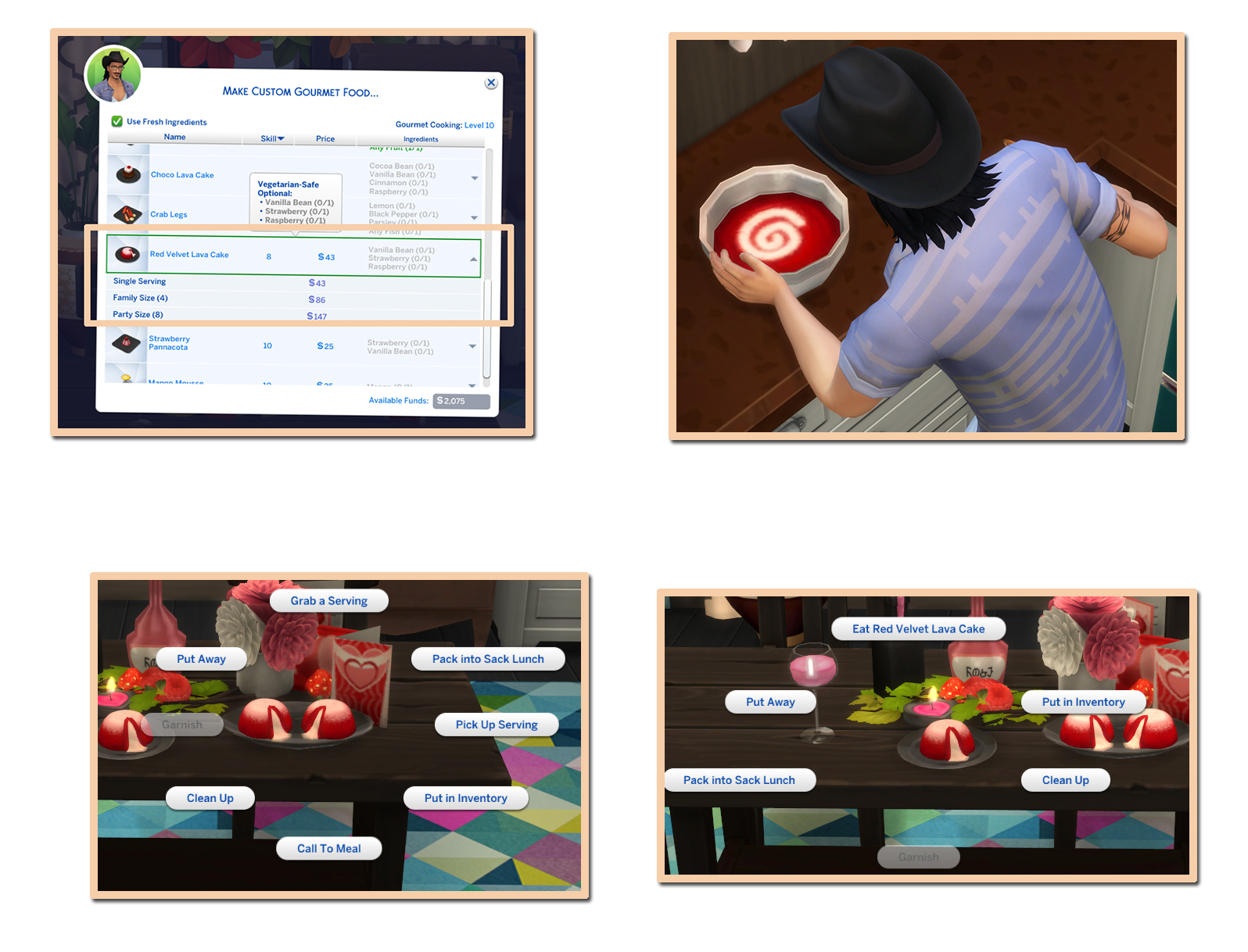 Adds a custom Gourmet recipe to the game – Red Velvet Lava Cake