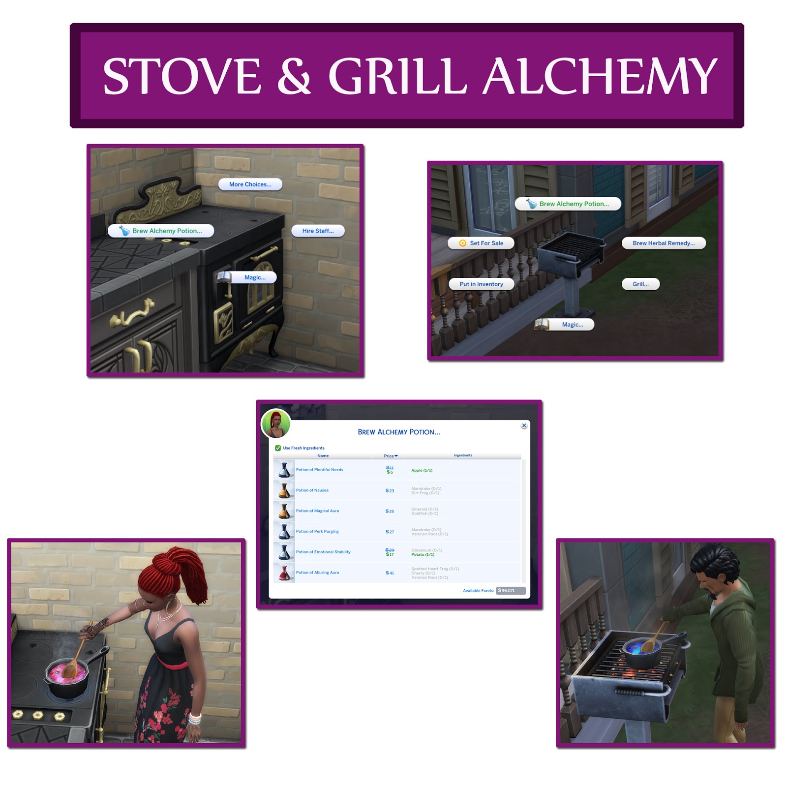 - Made the alchemy potion ingredients optional ( the potion can be made even if the ingredients are not in the sim’s inventory for a price).