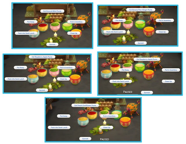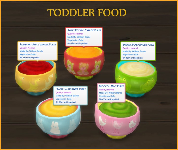 Pureed veggies and fruits provide nutrition to your little kiddos. Other sims can also grab them from the fridge for a quick meal