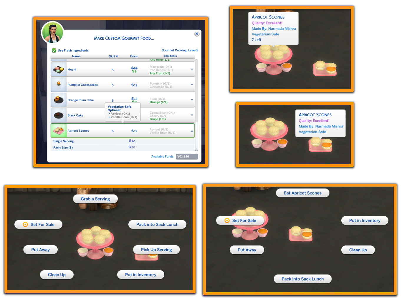- Optional Ingredient : 1 Apricot + 1 Vanilla + 4 simoleon flat fee for Single Dish