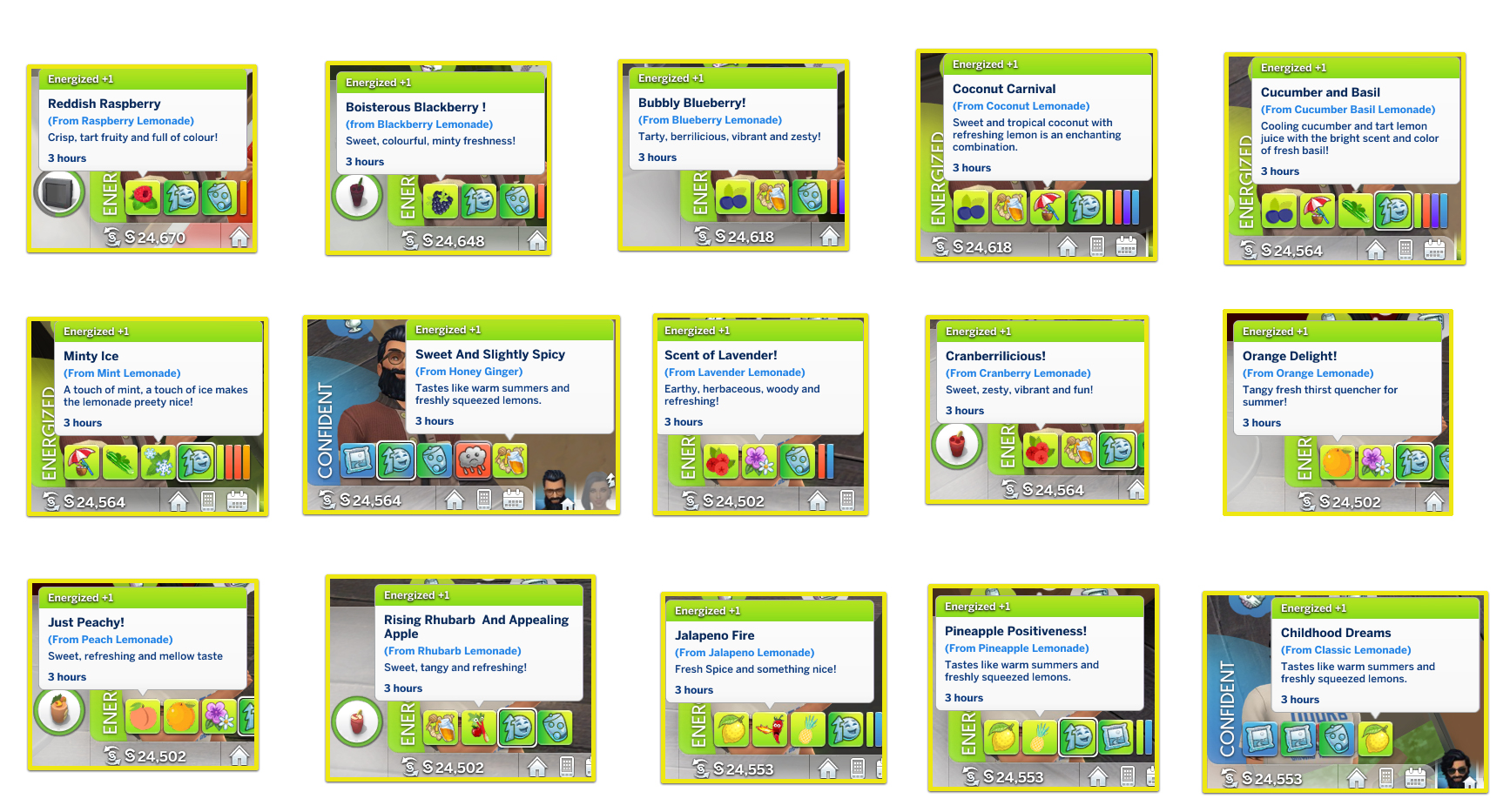 Recently installed this mod into my game as an alternative means to earn coin for a challenge I’m doing. Thing is, the interactions on the lemonade maker to obtain the actual servings to sell isn’t appearing in my sims queue. The option to make lemonade is fine, the recipe list is fine, the grab drink (for a single cup that my sim will drink) is fine, just not the other provided options, like making a jug of lemonade or grabbing the servings.