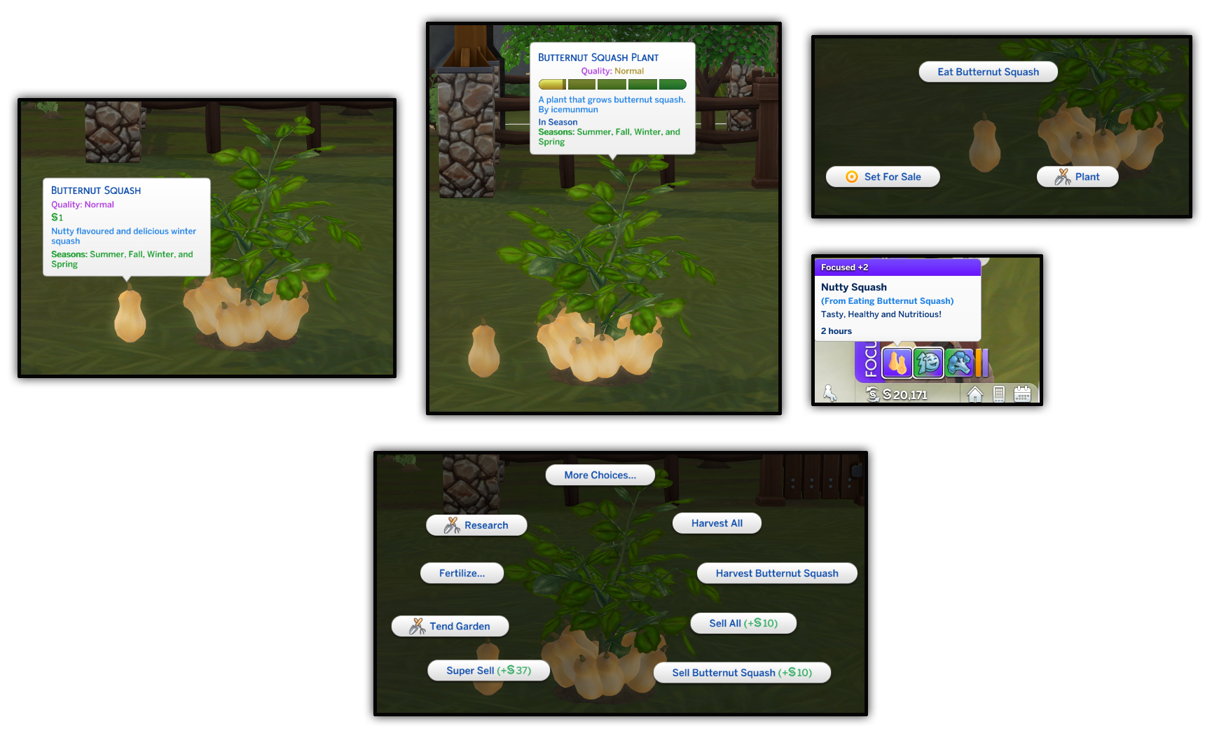 • Eating the Butternut Squash harvestable raw will give a moodlet/buff