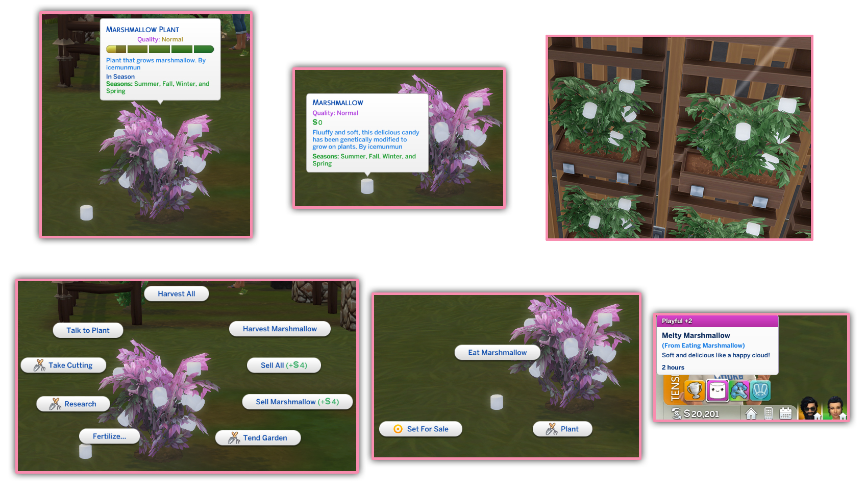- Eating the Marshmallow harvestable raw will give a moodlet/buff
