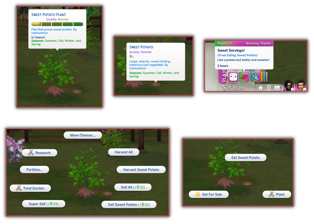 - Eating the Sweet Potato harvestable raw will give a moodlet/buff
