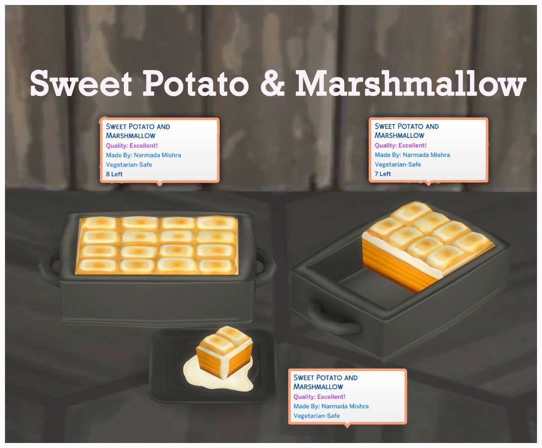 - Optional Ingredient : 1 Sweet Potato + 1 Marshmallow + Nutmeg + 1 Cinnamon + 0 simoleon flat fee for Single Dish