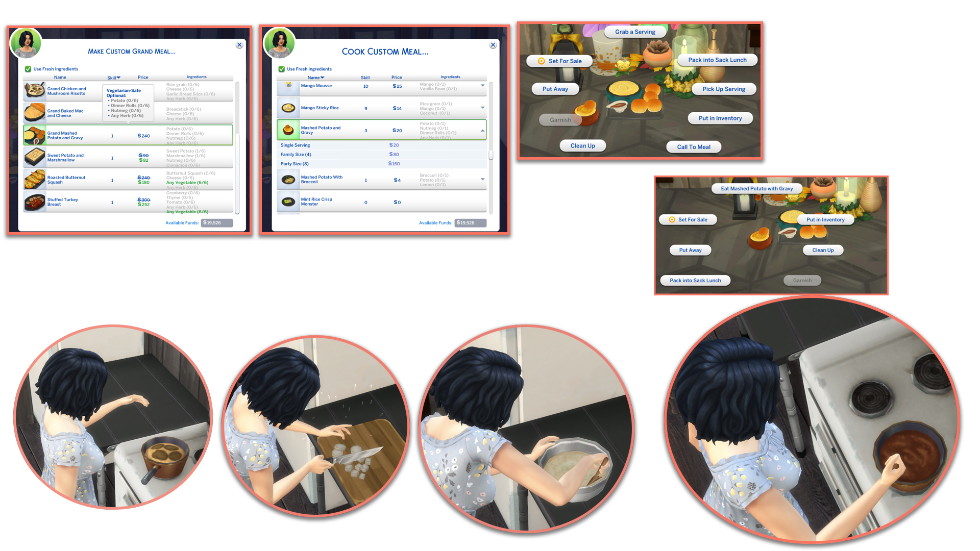 - Menu : Available from Custom Cook Menu on Fridge, Stove, (from Custom Food Interactions), Grand Meal and toddler menus. Also appears under Breakfast, Brunch, Lunch, Dinner Pie menus