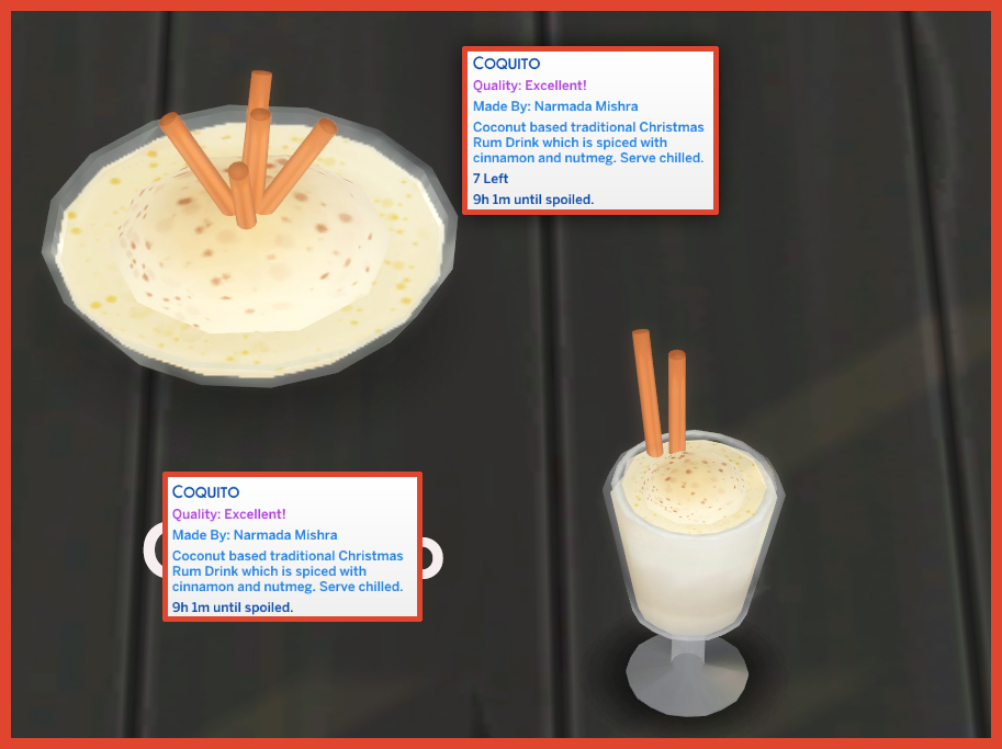 Drinking the Coquito will give a moodlet/buff