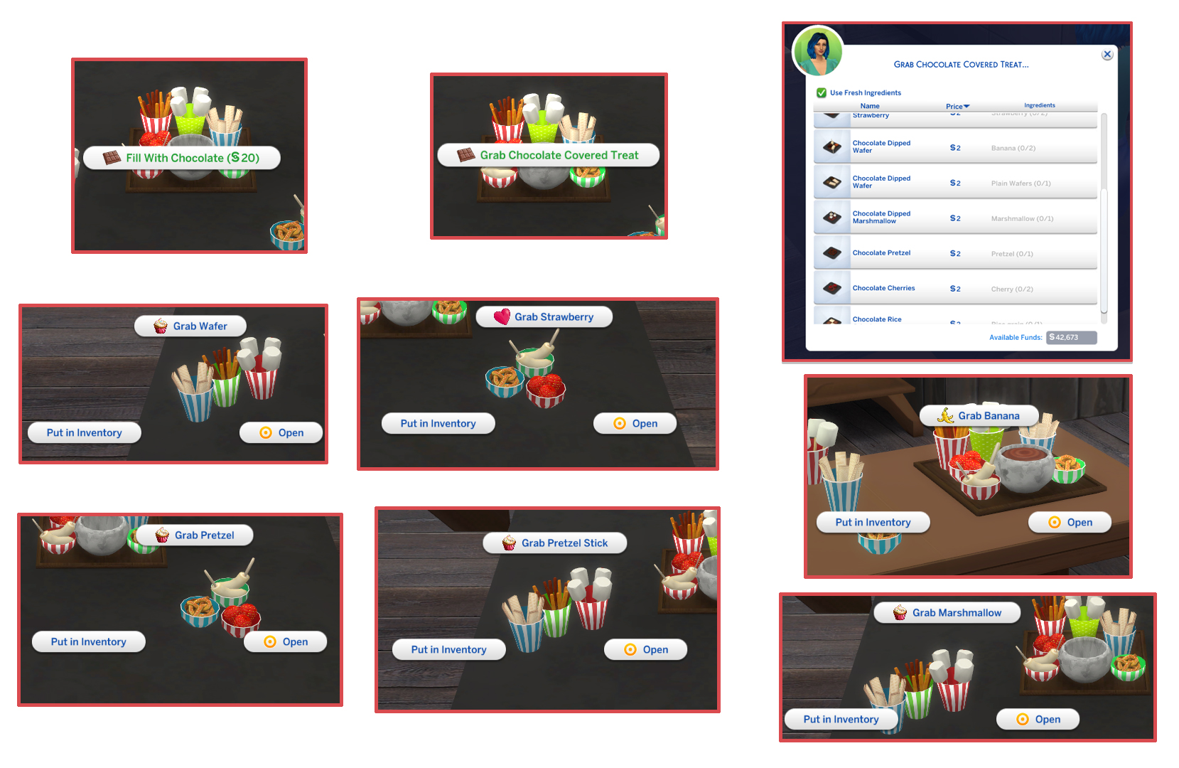 The accessories(Jar of Wafers, Bowl of Strawberry, Glass of Pretzel sticks, Bowl of Pretzel, Jar of Marshmallow on Sticks, Bowl of Bananas)isn't working properly, the animation happens but right at the end the sim is reset and there's nothing in the inventory…