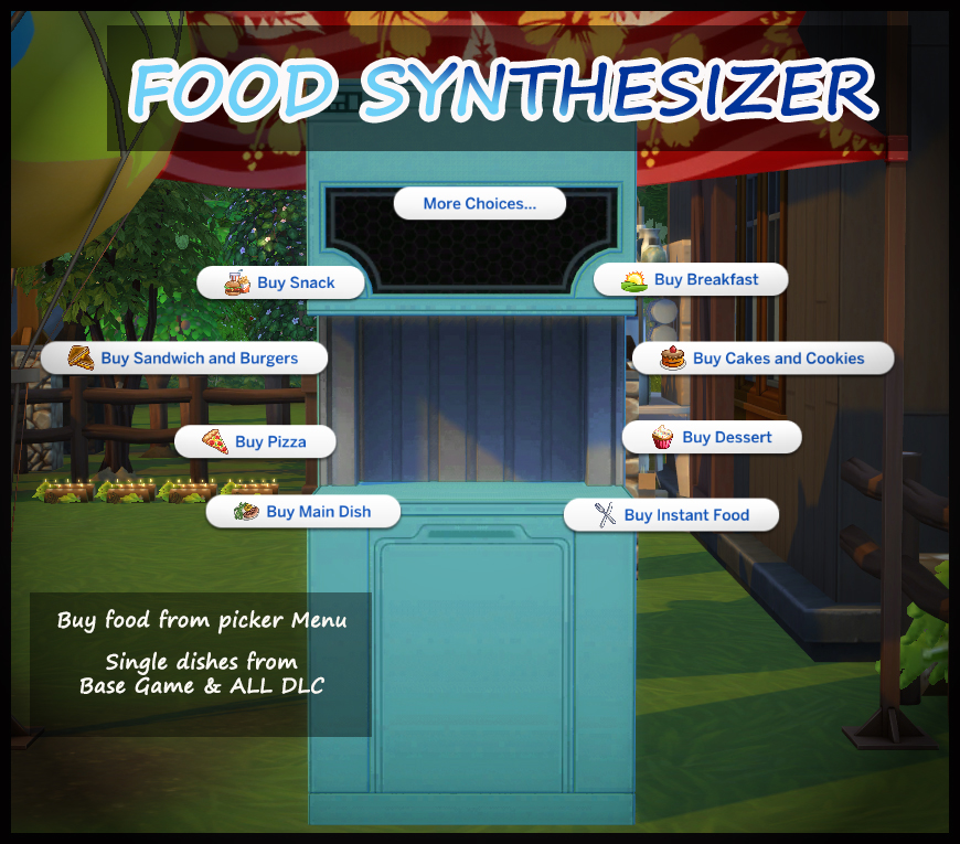 I wanted to make a food synthesizer like the one from Sims 3 Into the Future. I tried lots of things to make the food buyable by shortcuts but ultimately I had to go about it the long way if I wanted the food to have price points. I am happy with how it turned out!