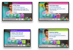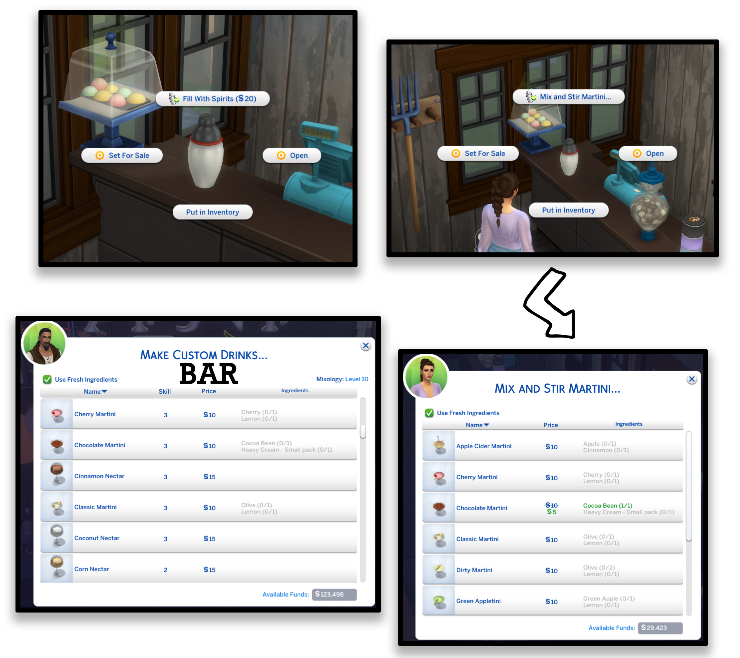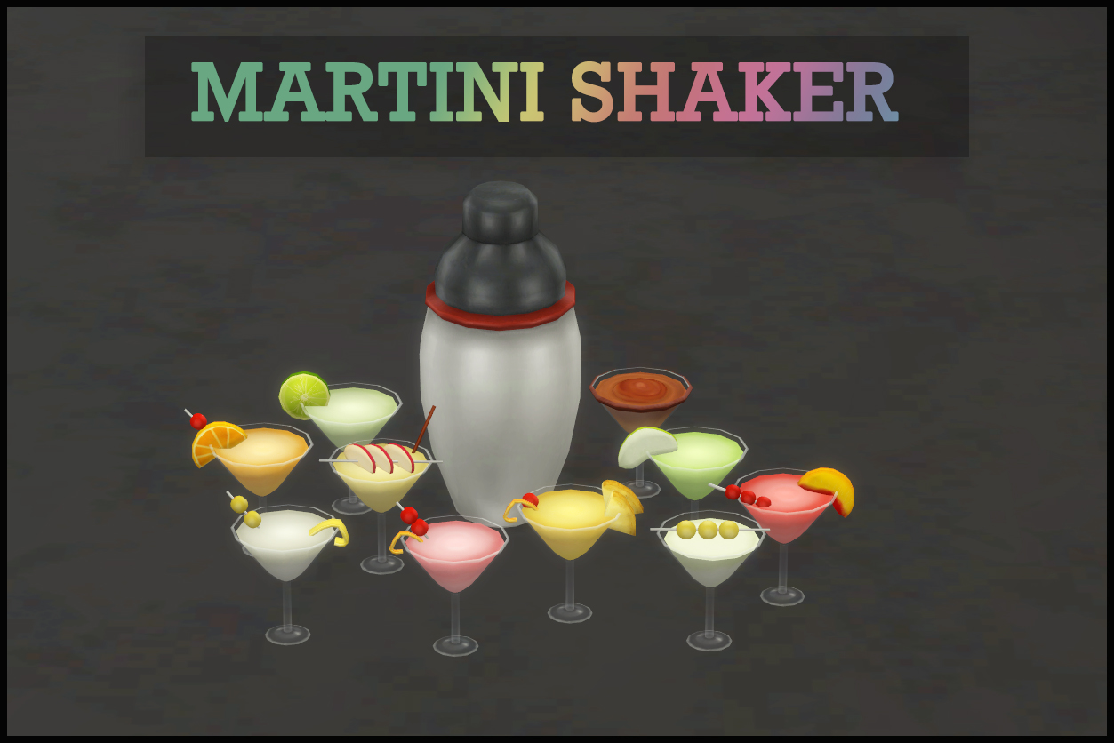– Opens a recipe picker menu from where sims can grab 10 types of Martinis