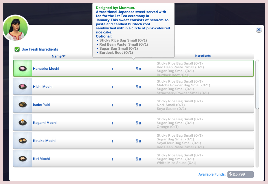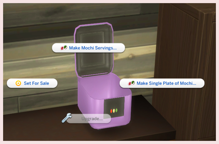 - Make Single Plate of Mochi – Opens Recipe Picker menu which shows a list of mochi to make ( See table). 1 Serving.