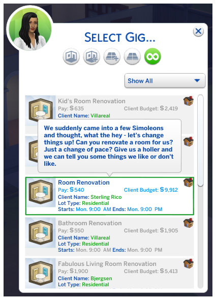 Yes!! I finally gor a gig offer. It promised to pay 500 + simoleons for decorating one room according to the owner’s specific tatses. Something about them inheriting some cash and wanting a refresh. Exciting right!!!