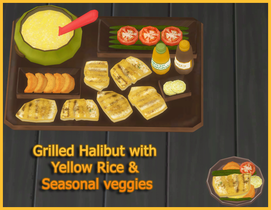 Adds a custom Grill recipe to the game – GRILLED HALIBUT WITH YELLOW RICE AND SEASONAL VEGGIES