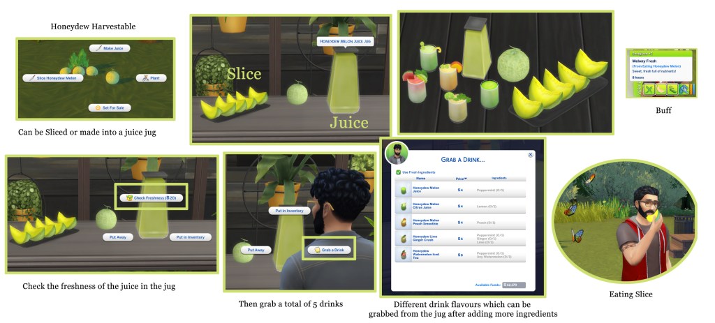 Eating the Honeydew Melon slice and Juices raw will give a moodlet/buff
