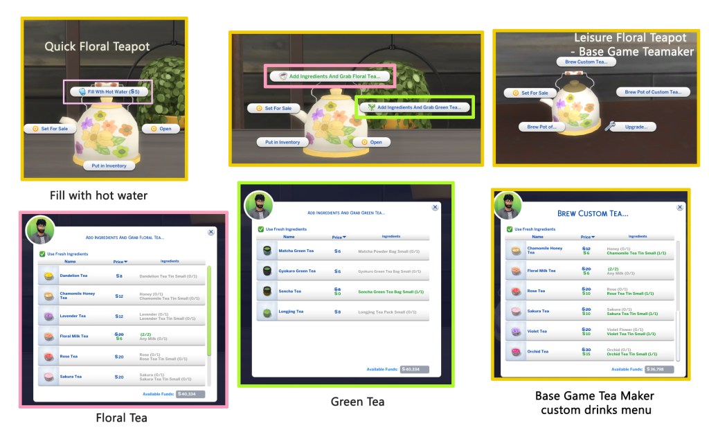 - Interactions – Base game Tea maker interactions , Custom tea interactions ( Custom drink Interaction mod updated on 14.04.2021)