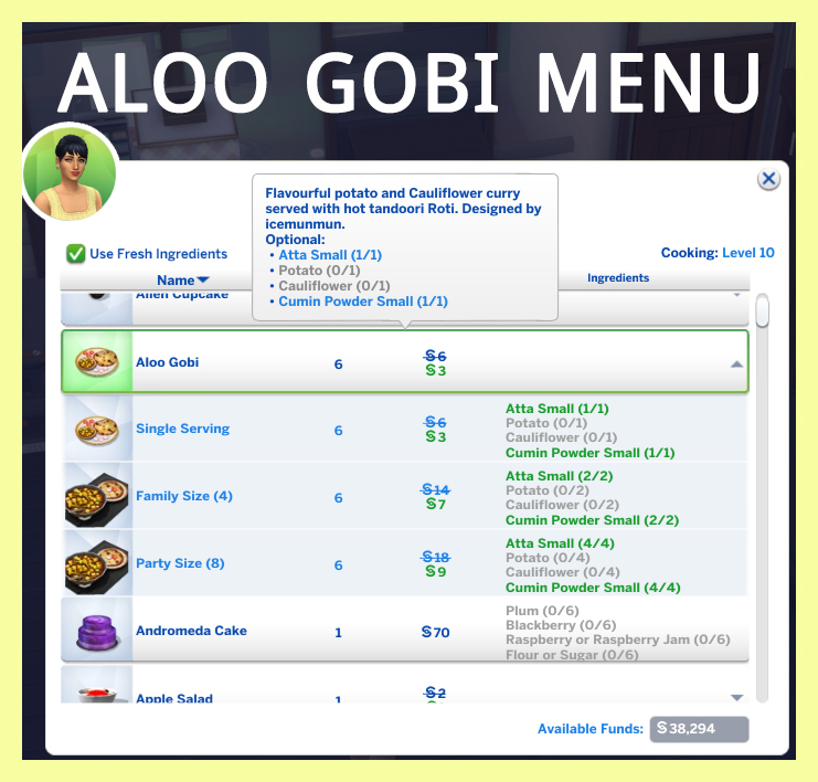- Optional Ingredient : Rice + Cauliflower + Potato + Mung Dal + 0 simoleon flat fee