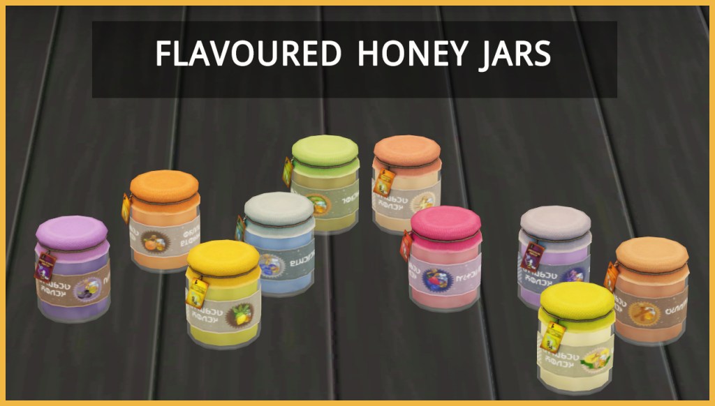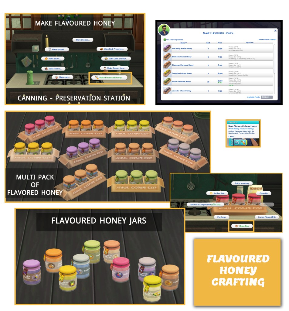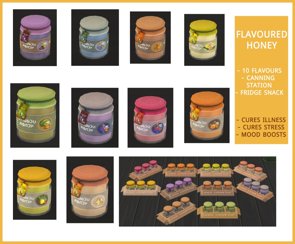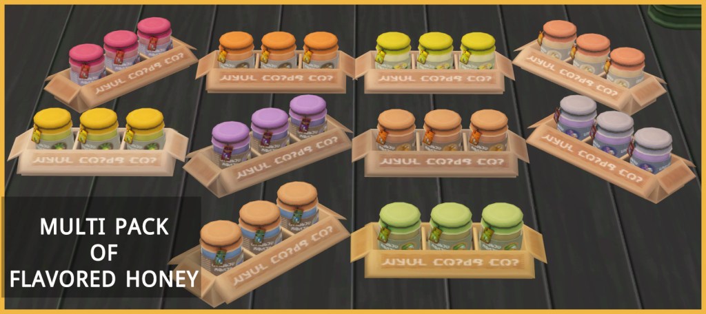 4. Assorted Box of individual Honey can be bough from the Build Buy Catalogue ( Misc appliances) . Requires the main Flavoured Honey File.