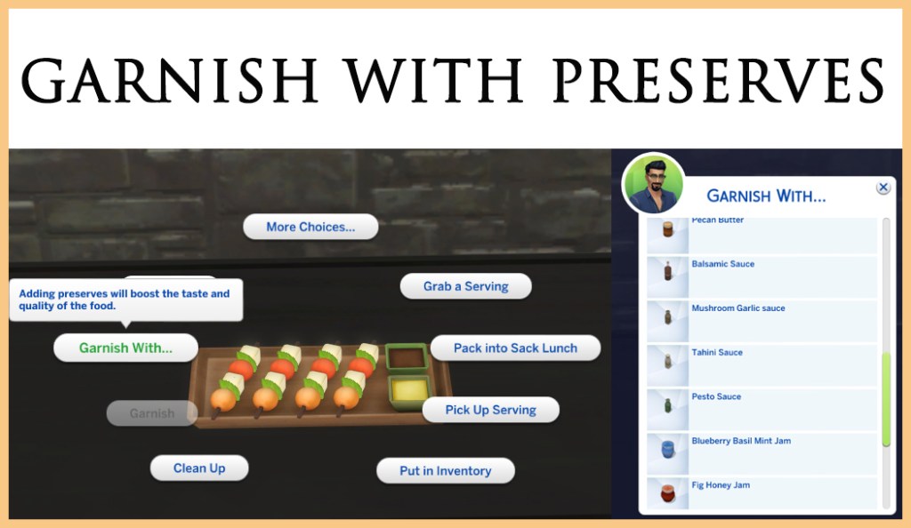 Garnish any multi serving of food with preserves! Requires Custom Food Interactions_Latestversion ( updated on 12.06.23)