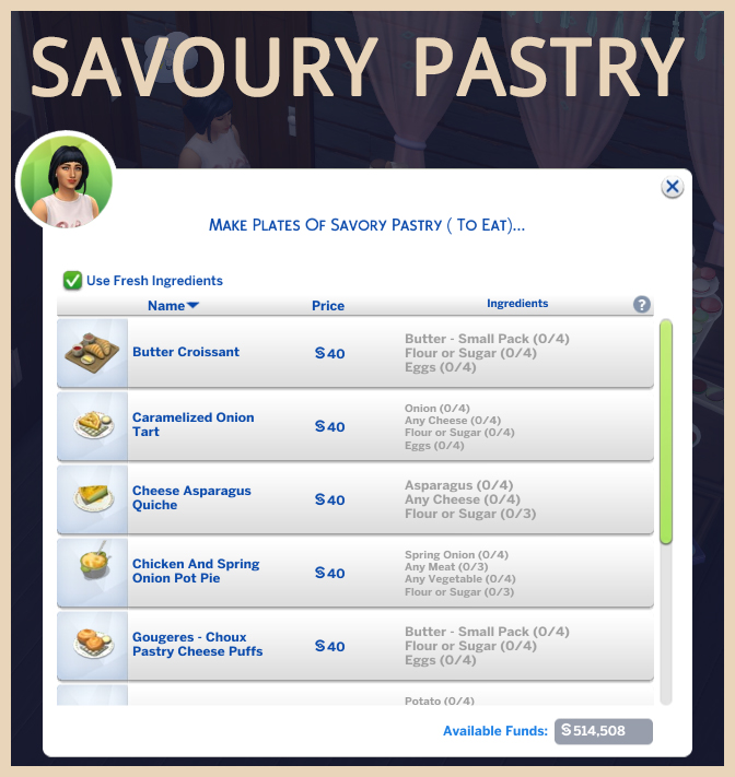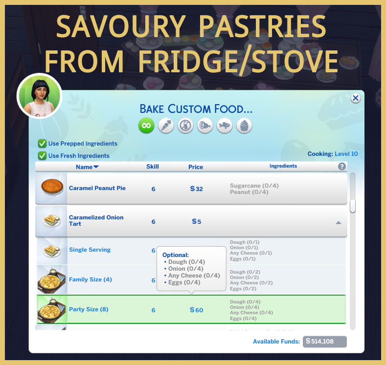 - Menu : Available from Custom Bake Menu on Fridge, Stove, (from Custom Food Interactions) ; Make Plate/Plates of Savory Pastry on Pastry Maker